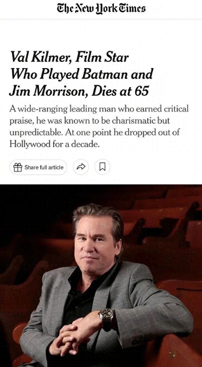 据外媒报谈,好莱坞知名演员方·基默(Val Kilmer)损失,享年65岁。