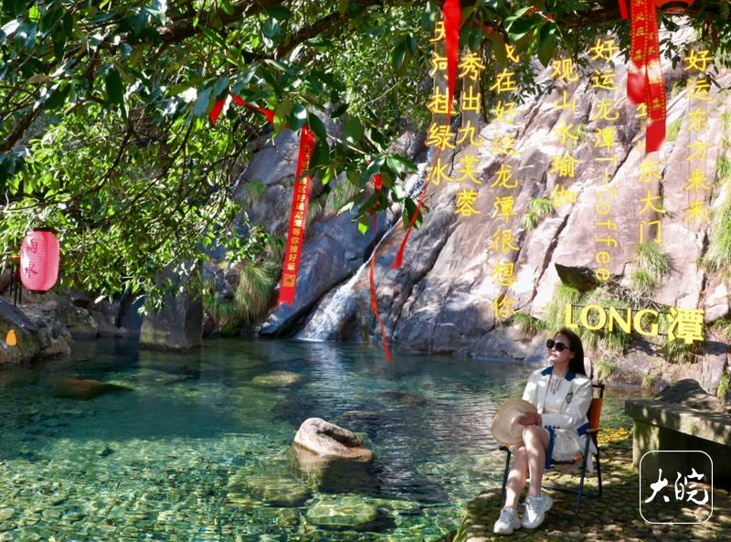 在青阳县九子岩景区,沿着障碍的山谈拾级而上,采风团一瞥到达清幽邃谧的九子岩龙潭景点。“龙潭”位于九子岩山谷深处,四周被苍翠的竹林和古树环绕,潭水澄澈见底,宛如一块碧绿的翡翠嵌入在山间。潭水之上,一谈瀑布从山崖间潺潺流下,在龙潭水面泛起层层动荡,阳光洒在潭面上,水光潋滟。据景区使命主谈主员先容,龙潭之名,相传开始于昔日朱元璋遁迹朱避店,出险之后,在此沐浴更衣,重整君主威仪,故名“龙潭”。