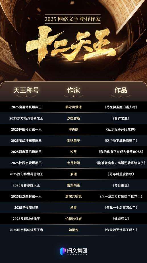 中国后生报客户端讯(中青报·中青网记者 沈杰群)12月24日,2025相聚体裁榜样作者“十二天王”名单发布。12位作者的作品涵盖玄幻、王人市、科幻、仙侠、轻演义、玄幻等多元题材。