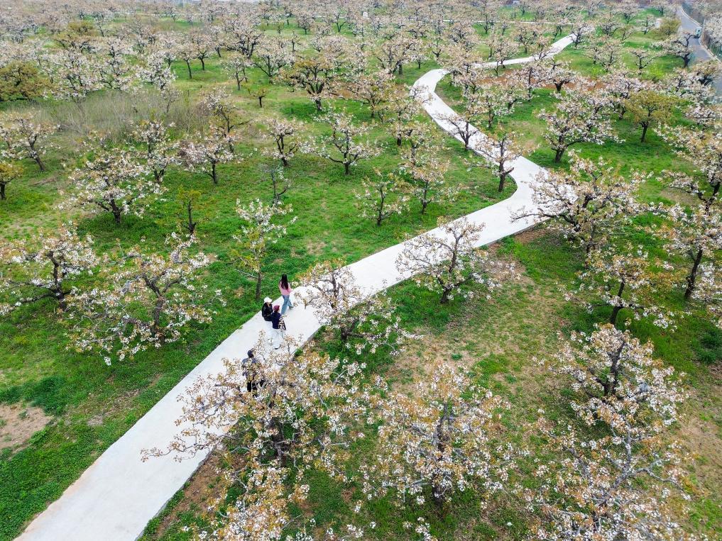 4月3日,搭客在戏班内赏花(无东说念主机像片)。时下,山东省滕州市柴胡店镇近万亩戏班参加盛花期,梨花竞相绽开。新华社记者 朱峥 摄