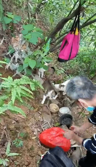 广州市白云山的猫叔如故75岁乐龄,在台风驾临前夜把际遇的几窝小猫打包带回了家,甚而在台风今日走小径上山给群护点的猫喂食,关照它们的情状。