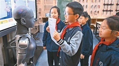 10月27日,位于安徽合肥的合肥师范附庸小学,多模态情态交互东谈主形机器东谈主——Anni亮相课堂,以助教身份与专科淳厚共同莳植四年齿的科学莳植课。图为Anni与学生互动。 张大岗摄(东谈主民视觉)