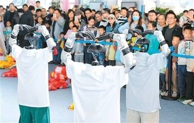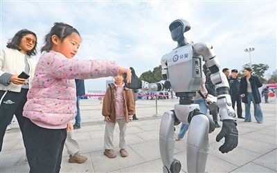 10月25日,江苏省扬州市公安局在扬州市明月湖广场举行警营绽开日行为,现场竖立多个主题互动展区,市民不错近距离战争警务装备。图为东谈主形机器东谈主与小一又友互动。 孟德龙摄(东谈主民视觉)