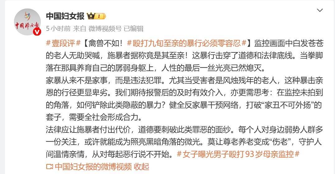 近日,一段“男人殴打93岁母亲”的视频在网崇高传。视频中,男人屡次扇老东谈主耳光、拽头发,将其按在地上殴打。